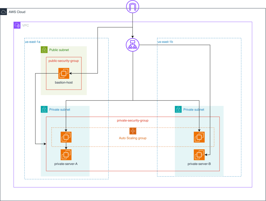 - Private instances reachable only from the bastion and ALB.
